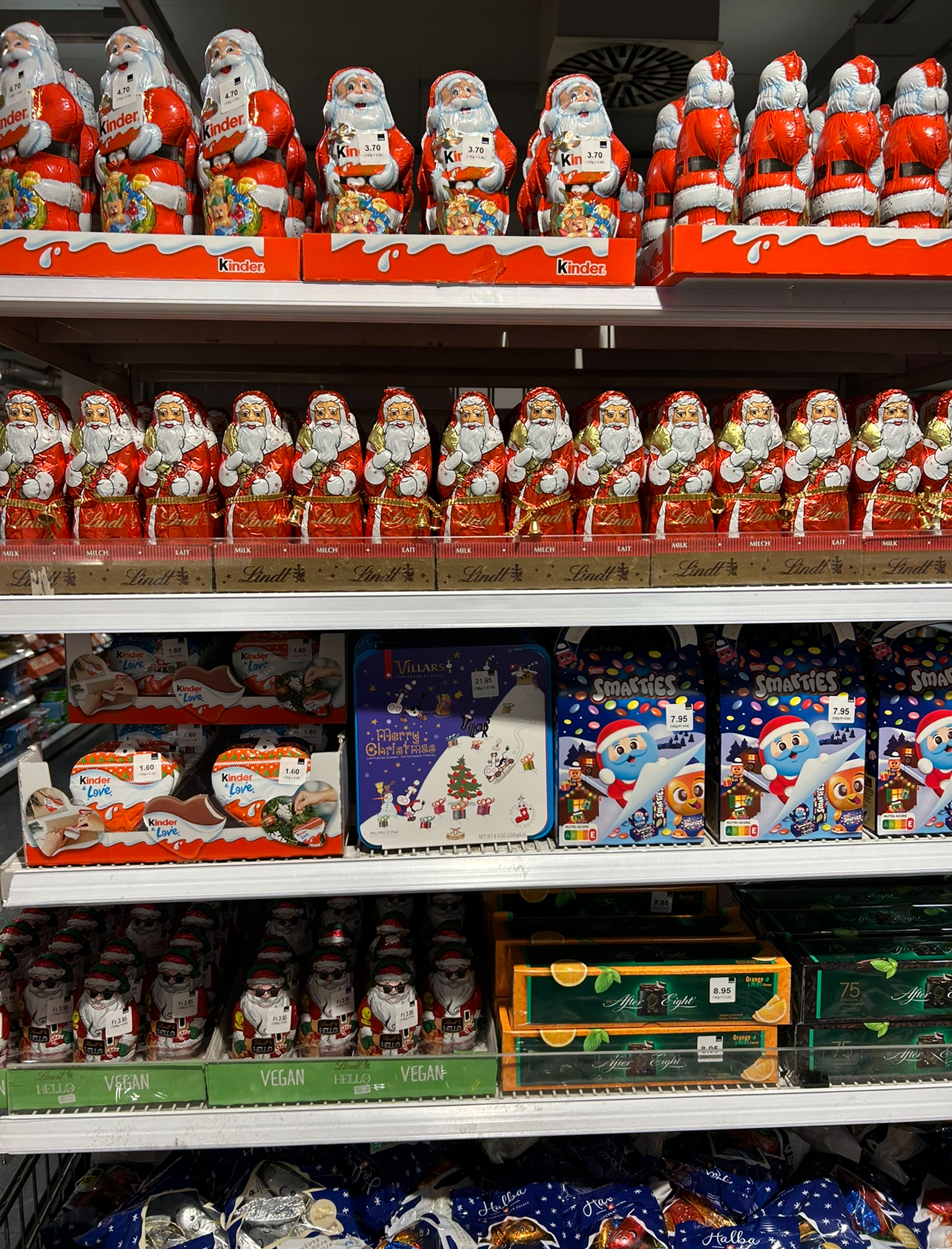 스위스 사람들은 평상시에도 초콜렛에 진심이지만 특히 조그마한 초콜릿을 더 만들만한 이유가 있으면 정말 완전 초콜릿을 향한 열정이 폭발한 지경에 이르는 것 같다. 특히 요즘 마켓에 가면 큰 산타클로스 초콜릿부터 루돌프 초콜릿까지 정말 정말 신났음을 목격할 수가 있다.